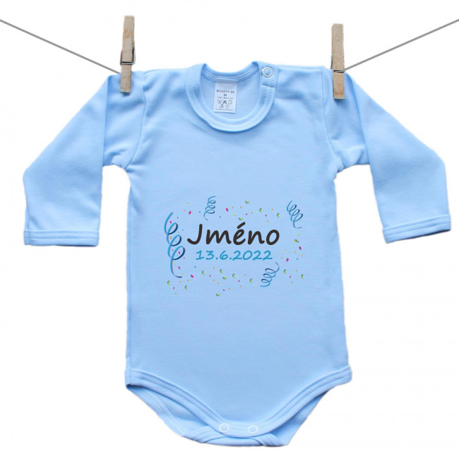 Modré body s dlouhým rukávem Se jménem děťátka a datem (Chlapec)