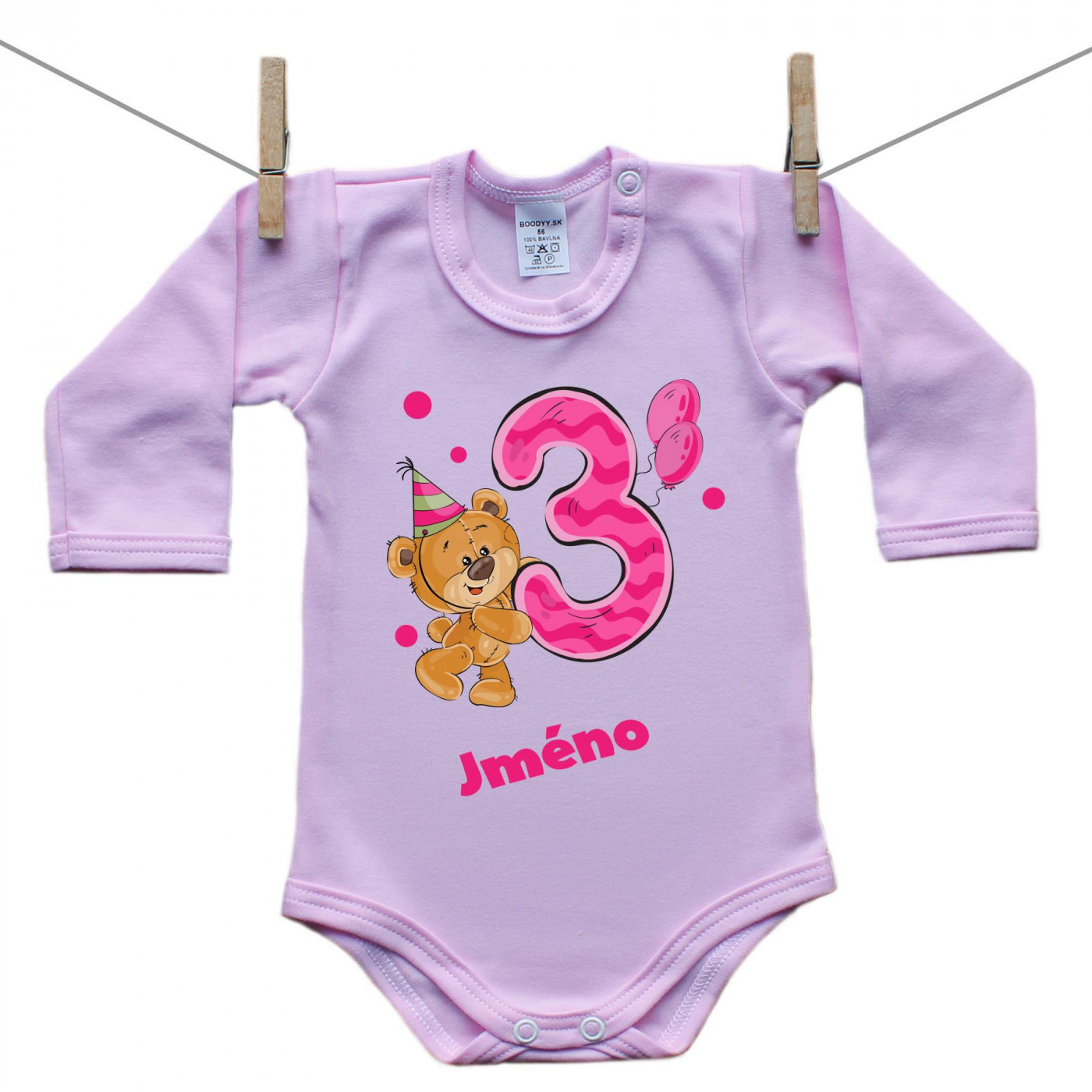 Růžové body s dlouhým rukávem Mám 3 roky s medvídkem pro holčičku