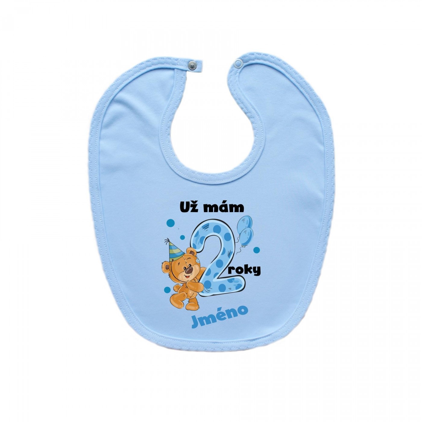 Modrý bryndáček na zapínání Už mám 2 roky s Medvídkem a jménem dítěte Chlapec