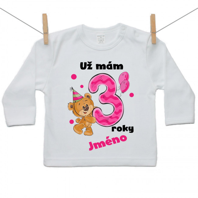 Tričko s dlouhým rukávem Už mám 3 roky s Medvídkem a jménem dítěte Dívka