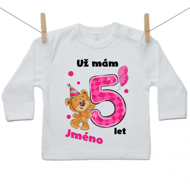 Tričko s dlouhým rukávem Už mám 5 let s Medvídkem a jménem dítěte Dívka