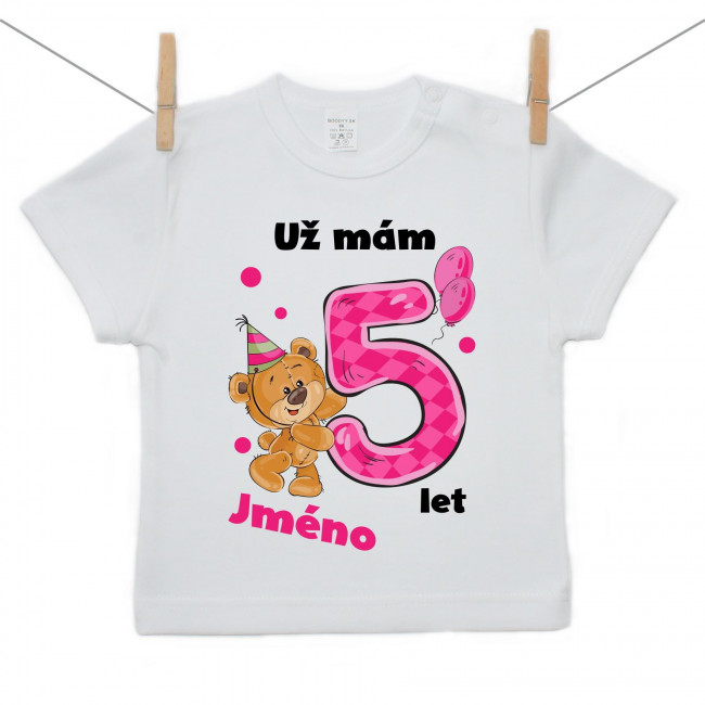 Tričko s krátkým rukávem Už mám 5 let s Medvídkem a jménem dítěte Dívka