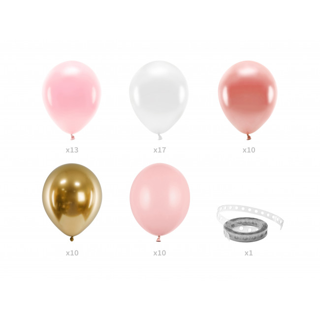 - Sada obsahuje celkem 60 balónků: lesklé zlaté, pastelové růžové, metalické rose gold, pastelové pudrové a metalické bílé.