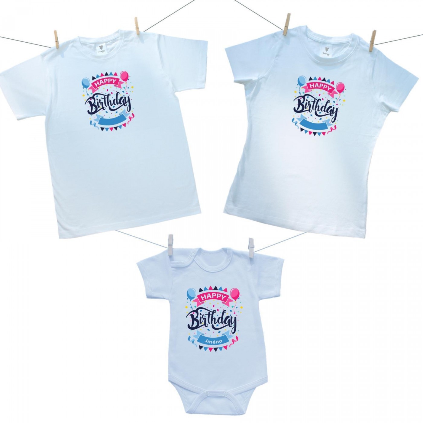 Rodinná sada (body s krátkým rukávem) Happy birthday s jménem dítěte