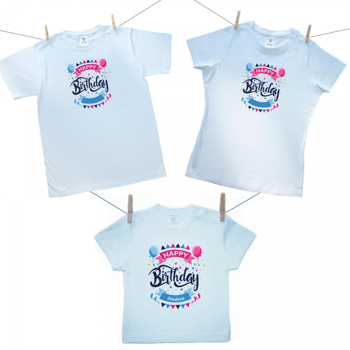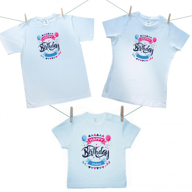 Rodinná sada (tričko s krátkým rukávem) Happy birthday s jménem dítěte