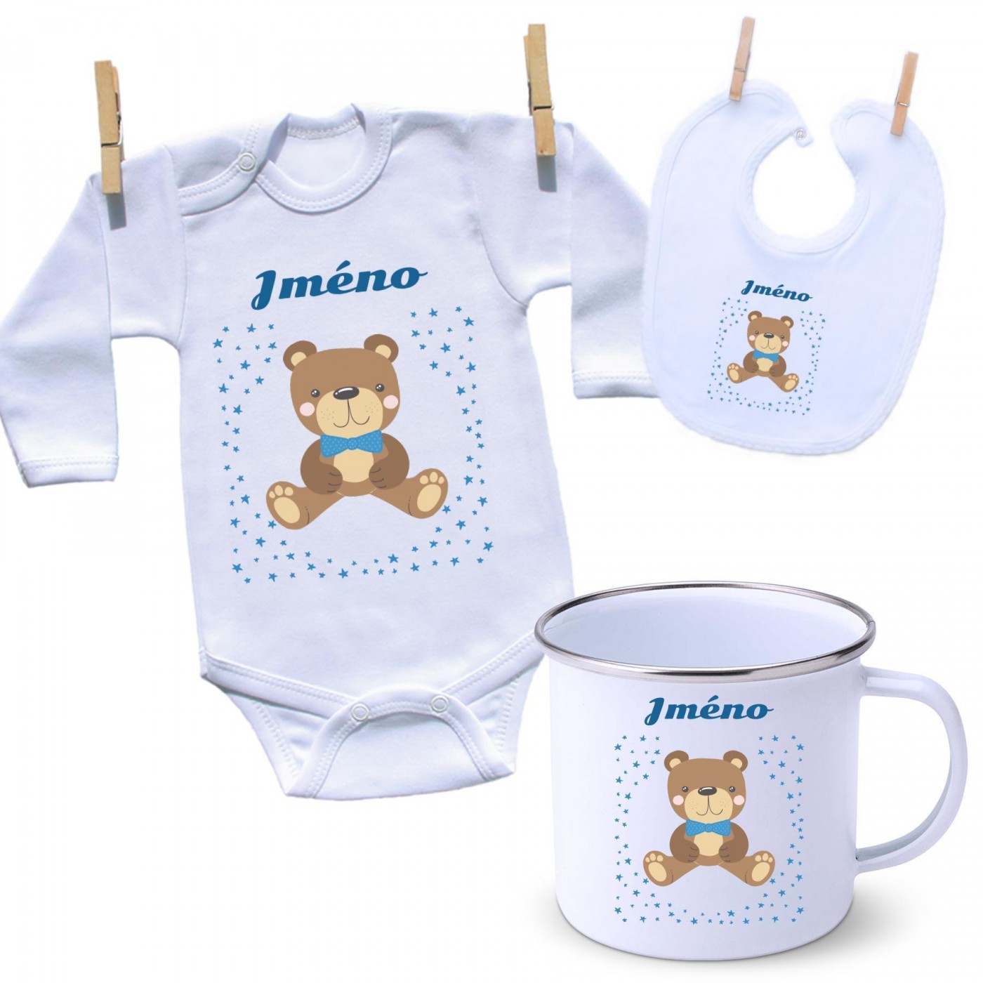 Krásná sada oblečení a bílého smaltovaného hrnku s originálním nápisem.